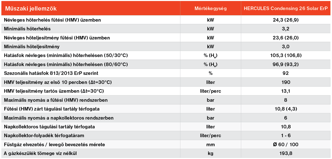 A HERCULES Solar 25 típusú álló, kondenzációs elven működő gázkazán 20,2 kW teljesítménnyel képes fűtési, és 24,8 kW-tal használati melegvizet előállítani. A gázkészülék gyárilag fel van készítve napkollektorok csatlakoztatására, beépítve tartalmaz minden gépészeti és szabályozó egységet! A készülék 200 literes, rozsdamentes acélból készült beépített használati melegvíz tárolóval rendelkezik. A tároló két fűtőcsőkígyója közül az egyik a napkollektoros rendszerrel hidraulikai köréhez csatlakozik. A HERCULES Solar 25 kazánok többzónás rendszerben is alkalmazhatók, zónánkénti szobatermosztátos szabályozással. Az opcionális bővítőkészletekkel legfeljebb három fűtési zóna kilakaítása lehetséges, melyek közül kettő keverőszelepes (alacsony hőmérsékletű) is lehet. A HERCULES Solar készülékek nagy vízterű fűtési rendszerekhez is alkalmazhatók. Külső érzékelő (opcionális) csatlakoztatása esetén időjárásfüggő szabályozás (alap felszereltség) használata is lehetséges.