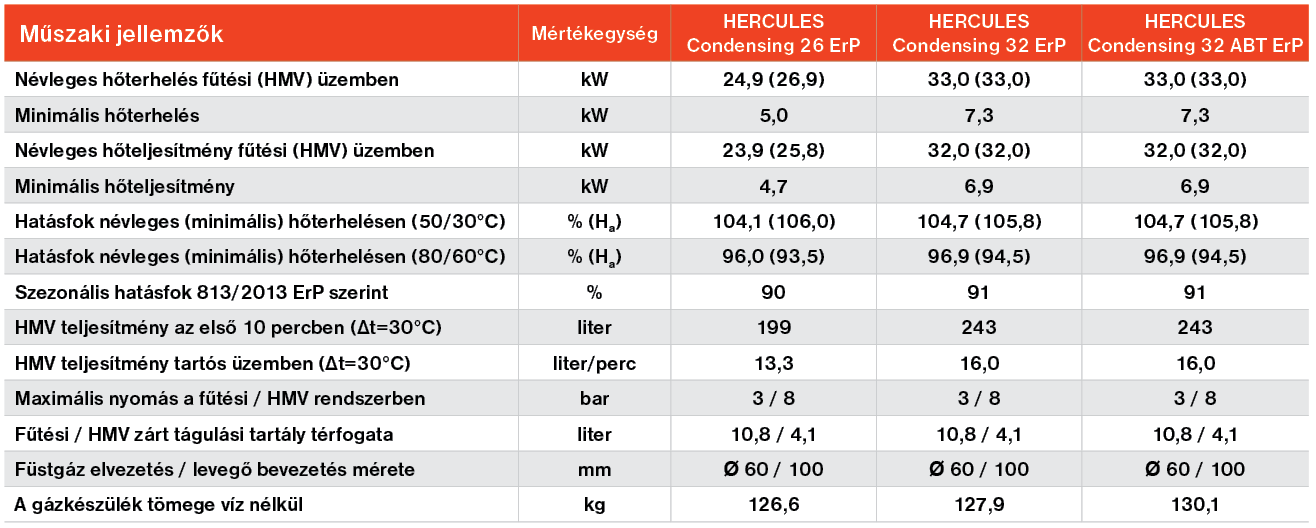 A HERCULES Condensing 32 ABT ErP típusú álló, kondenzációs elven működő gázkazán 32 kW teljesítménnyel képes fűtési és használati melegvizet előállítani. A készülékek 120 literes, rozsdamentes acélból készült beépített használati melegvíz tárolóval rendelkeznek. A tároló a készülék alsó részén helyezkedik el, fölötte a gáz berendezések illetve a hidraulikai egységek találhatók. Ennek az elrendezésnek köszönhetően a készülék kompakt méretű. A HERCULES Condensing ErP kazánok többzónás rendszerben is alkalmazhatók, zónánkénti szobatermosztátos szabályozással. Az opcionális bővítőkészletekkel legfeljebb három fűtési zóna kilakaítása lehetséges, melyek közül kettő keverőszelepes (alacsony hőmérsékletű) is lehet. Az ABT változat alap kiépítésben tartalmazza az egy direkt kör mellett, a plusz egy keverőszelepes zónaegységet. A HERCULES Condensing ErP készülékek nagy vízterű fűtési rendszerekhez is alkalmazhatók. A tároló két fűtőcsőkígyója révén napkollektoros rendszerrel is összeköthető. A készülék az (opcionális) Super Amico távszabályzóval könnyen és gyorsan, a készüléktől távolról is vezérelhető. Külső érzékelő (opcionális) csatlakoztatása esetén időjárásfüggő szabályozás (alap felszereltség) használata is lehetséges.